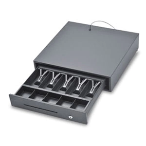Caja gaveta recubierta con pintura epoxi. Cuenta con 5 divisiones para billetes y monedas con apertura eletrónica para trabajar en sincronismo