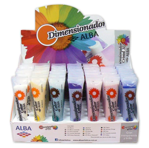 Dimensionador marca Alba, de 40ml. Color: Carmín nacarado. Formulado para realizar todo tipo de trazos o superficies en relieve, sobre gran variedad de materiales, manteniendo el espesor de aplicación. Variando la altura de corte del pico se regula la cantidad a aplicar.Superficie de aplicación: fibrofácil, tela, cartón, cerámica, cuero, acrílico, etc.