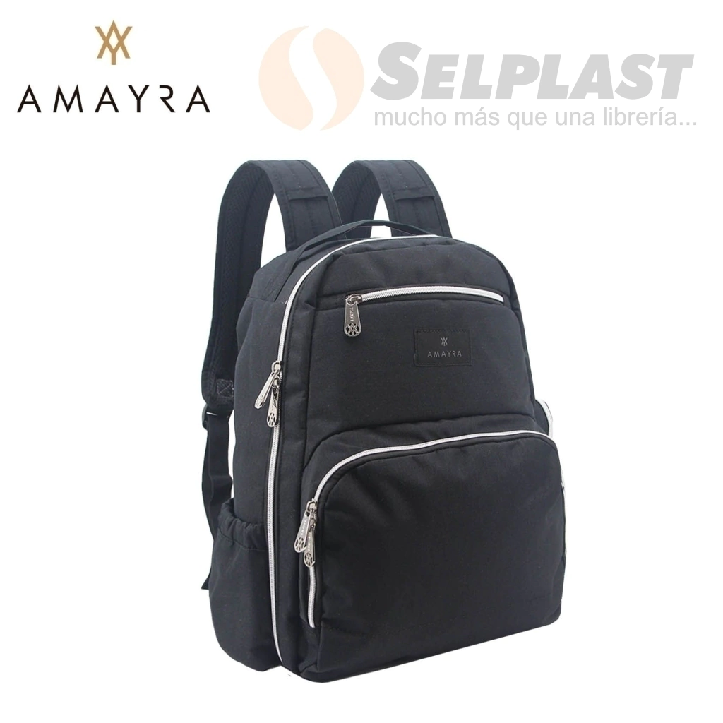 Mochila Maternal con un compartimento principal de 2 bolsillos abiertos, un bolsillo de pared con abrojo que incluye el cambiador. Viene con bolsillo frontal con cierre (con 2 bolsillos de mamadera aislados y un bolsillo de malla en el interior). Tiene en un lateral un bolsillo y en el otro una caja de plastico para toallitas humedas con cierre.